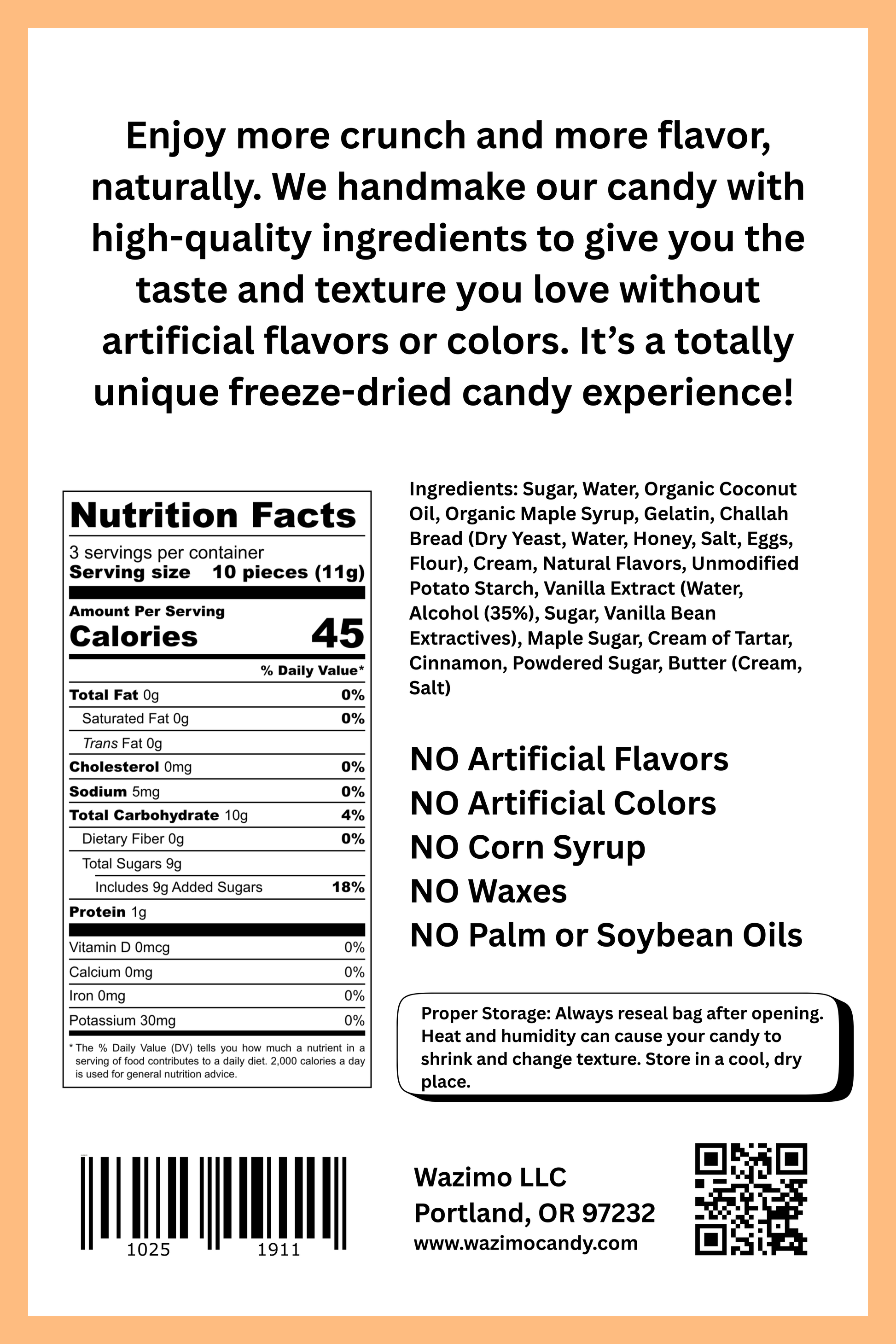 We are hardcore candy people, but we also love a good breakfast. So we decided to combine our two passions into our French Toast freeze-dried candy. We use chunks of fresh-baked challah bread, organic maple syrup, and organic powdered sugar to create an authentic French Toast experience in a light, crunchy candy.