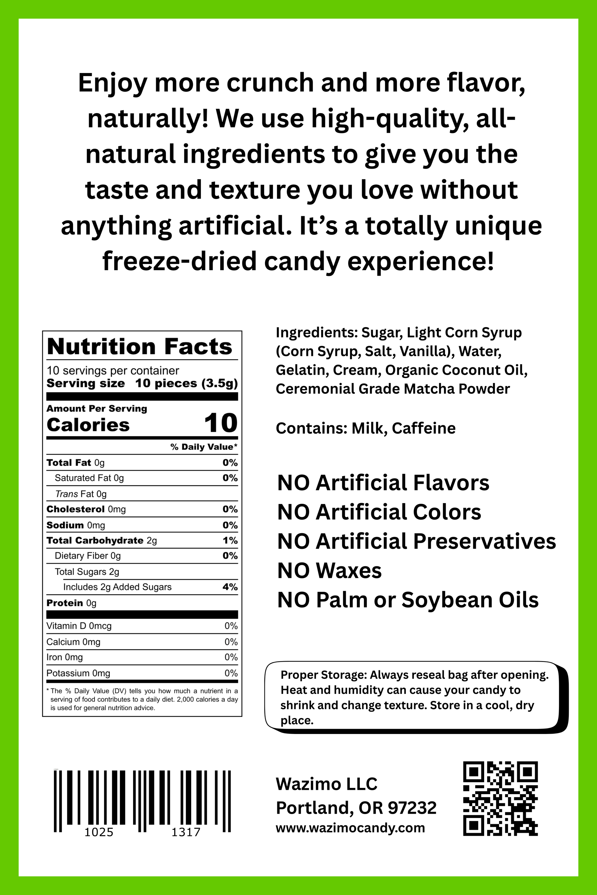 Enjoy all the flavor and benefits of a high-quality matcha latte wherever you go. We meticulously brew our ceremonial-grade matcha in the traditional process before we turn it into a crunchy, low-calorie candy that surpasses what you will find in most tea houses. I