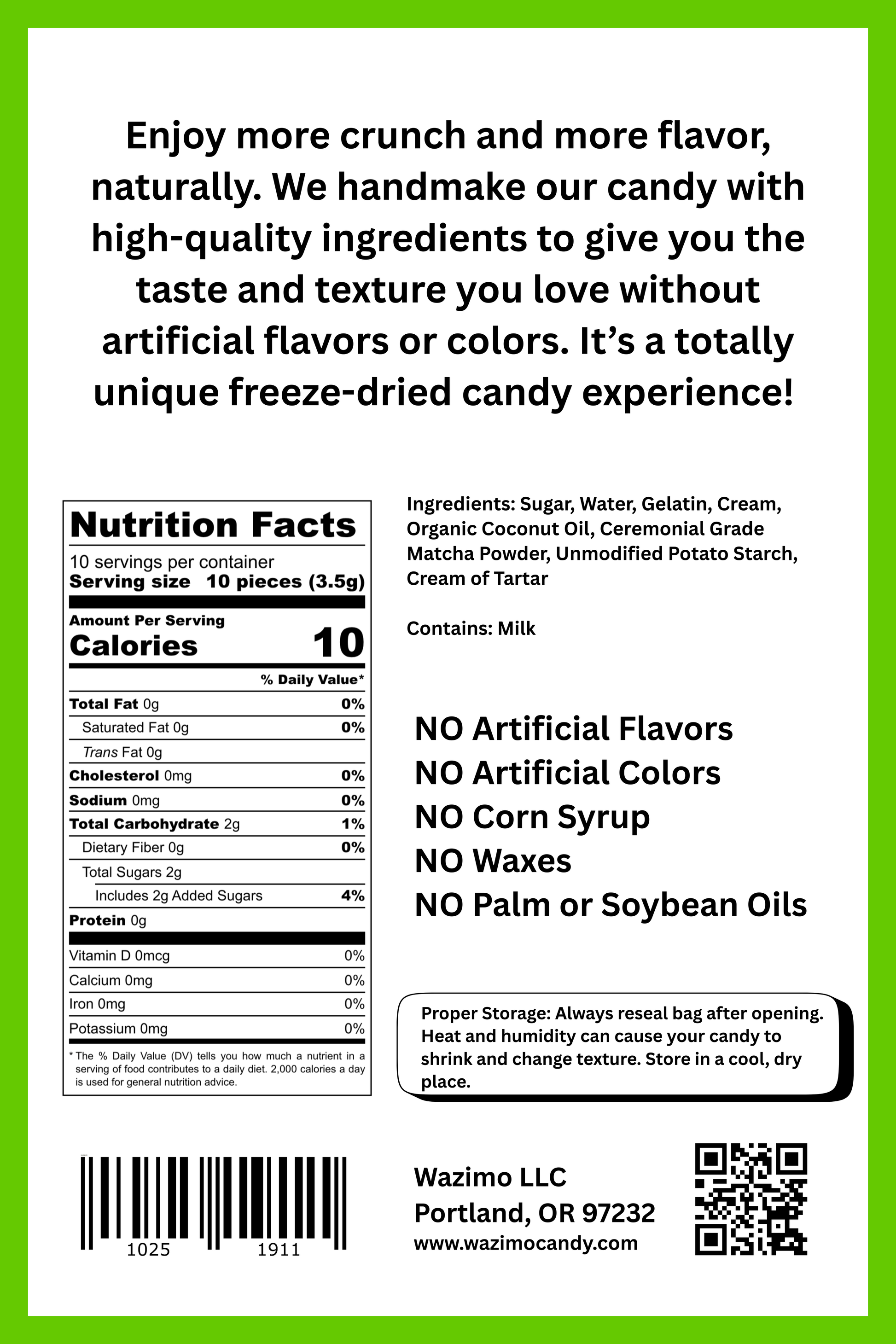 Enjoy all the flavor and benefits of a high-quality matcha latte wherever you go. We meticulously brew our ceremonial-grade matcha (no culinary-grade matcha here) in the traditional manner before we turn it into a crunchy candy that surpasses what you will find in most tea houses.