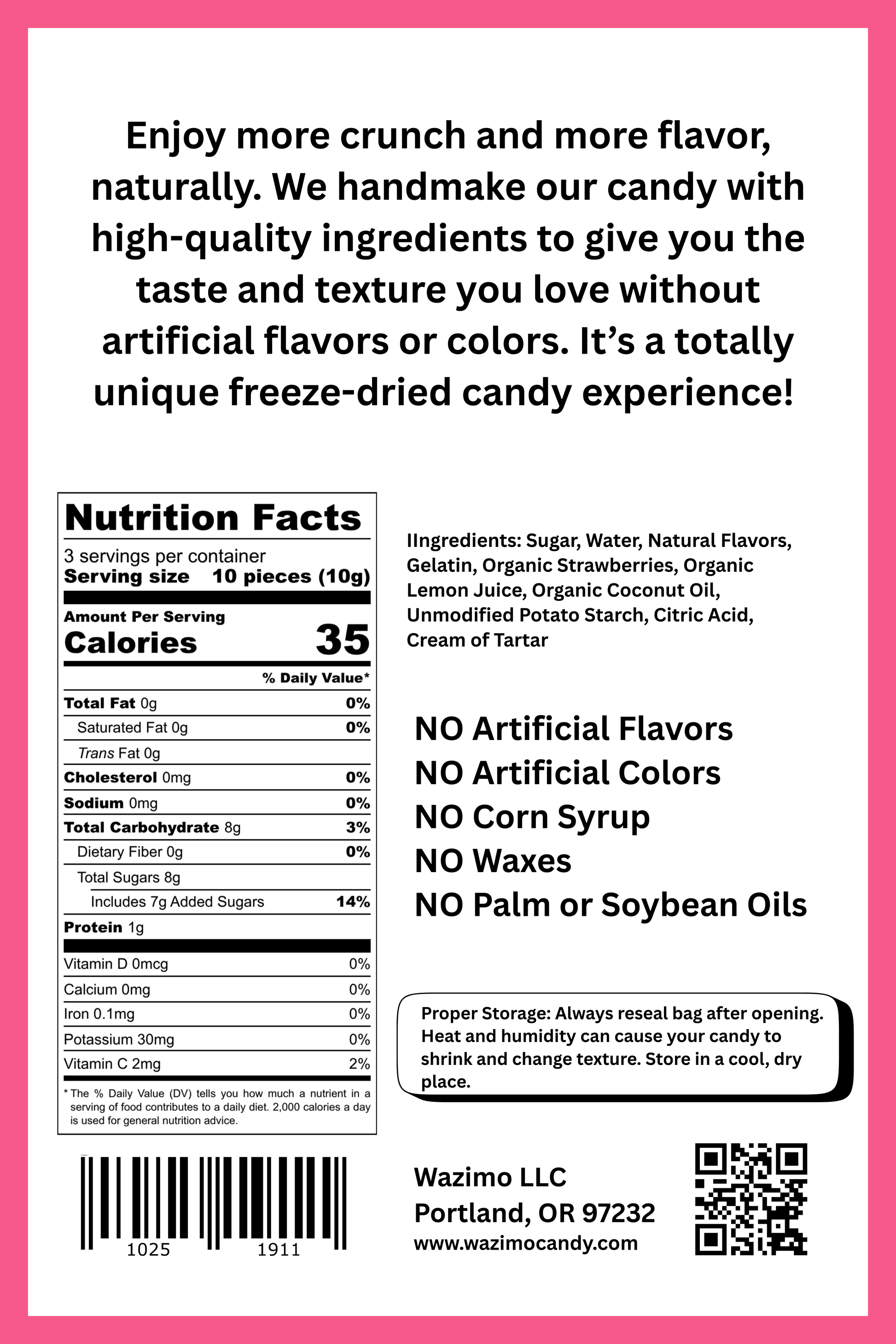 Our Strawberry Lemonade freeze-dried candy gives you a little bit of sour with a whole lot of sweet. We blend organic strawberries with organic lemon juice to bring you the best version of this classic combo. They are so light and refreshing, the biggest challenge is stopping yourself from eating the whole bag in one sitting.